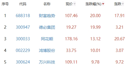 其中,财富趋势、德必集团、同花顺、鸿博股份、万兴科技位列板块涨幅前五位,涨幅分别为20.00%、19.99%、13.12%、10.01%、9.78%。