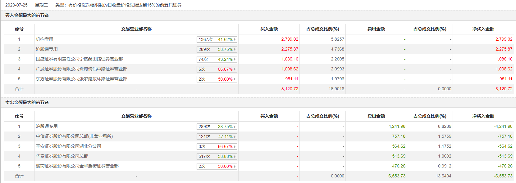 7月25日,财富趋势今日涨停,龙虎榜数据显示,上榜营业部席位全天成交1.47亿元,占当日总成交金额比例为30.54%。其中,买入金额为8120.72万元,卖出金额为6553.72万元,合计净买入1567.0万元。