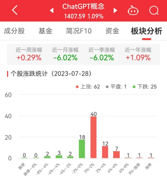 中国经济网北京7月28日讯今日,ChatGPT概念板块整体涨幅1.09%,其中,62只股票上涨,1只股票平盘,25只股票下跌。