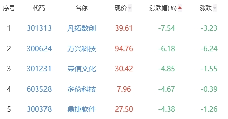 凡拓数创、万兴科技、荣信文化、多伦科技、鼎捷软件位列涨幅榜后五位,涨幅分别为-7.54%、-6.18%、-4.85%、-4.67%、-4.38%。