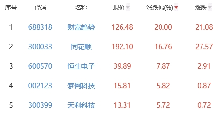 其中,财富趋势、同花顺、恒生电子、梦网科技、天利科技位列板块涨幅前五位,涨幅分别为20.00%、16.76%、7.87%、5.82%、5.72%。