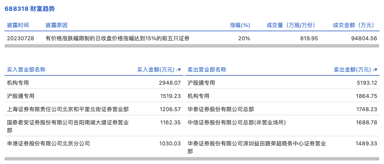 7月28日,财富趋势今日涨停,龙虎榜数据显示,上榜营业部席位全天成交1.99亿元,占当日总成交金额比例为20.94%。其中,买入金额为7866.25万元,卖出金额为1.2亿元,合计净卖出4117.97万元。