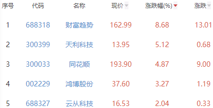 其中,财富趋势、天利科技、同花顺、鸿博股份和云从科技位列板块涨幅前五位,涨幅分别为8.68%、5.12%、4.87%、3.27%和2.04%。