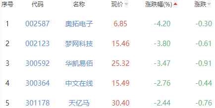 奥拓电子、梦网科技、华凯易佰、中文在线和天亿马位列涨幅榜后五位,涨幅分别为-4.20%、-3.80%、-3.47%、-2.76%和-2.44%。