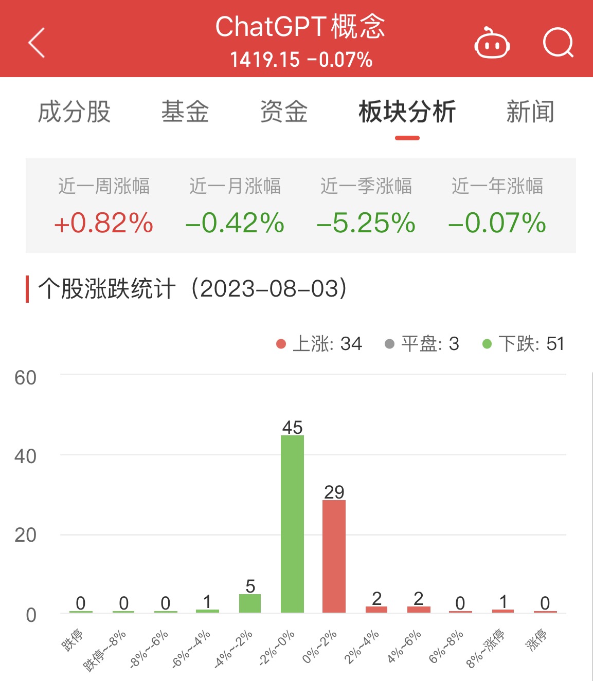 中国经济网北京8月3日讯今日,ChatGPT概念板块整体涨幅-0.07%,其中34只股票上涨,3只股票平盘,51只股票下跌。