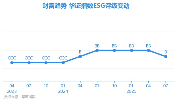 从细项得分来看,财富趋势E项得分53.41,评级为C,行业内排名152/156(E项目评分维度包括气候变化、资源利用、环境污染、环境友好、环境管理);S项得分77.43,评级为BB,行业内排名136/156(S项目评分维度包括人力资本、产品责任、供应商、社会贡献、数据安全与隐私);G项得分82.63,评级为BBB,行业内排名39/156(G项目评分维度包括股东权益、治理结构、信披质量、治理风险、外部处分、商业道德)。