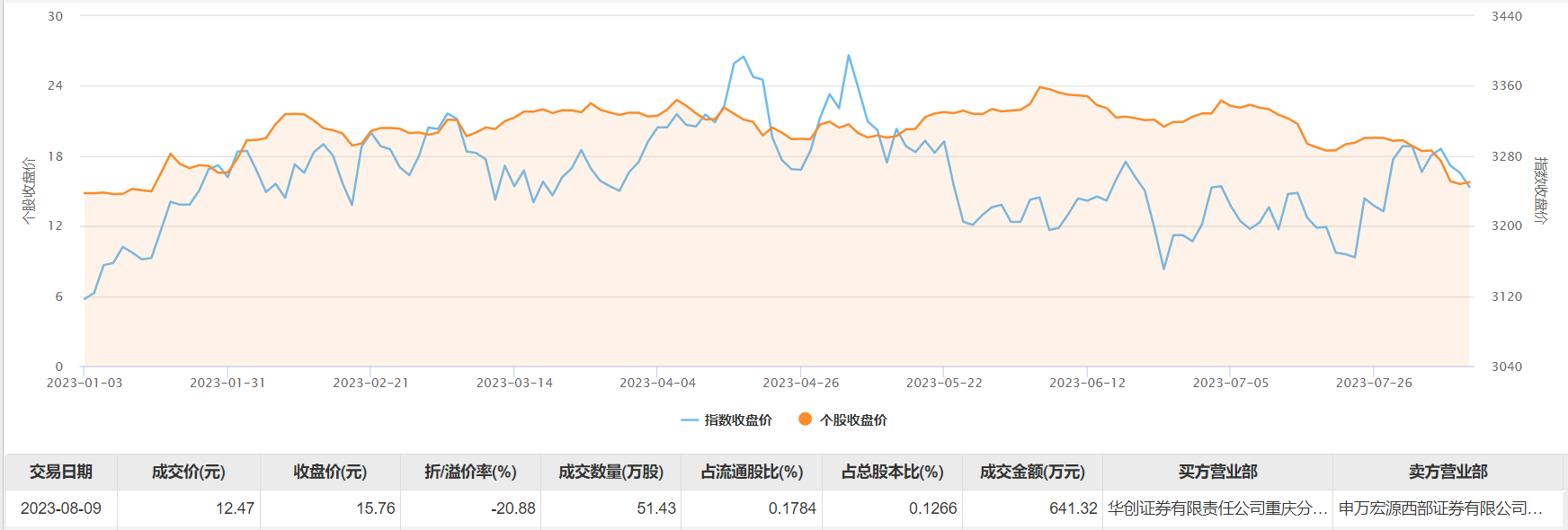 8月9日大宗交易成交51.43万股,成交额641.32万元,占当日总成交额的11.48%,成交价12.47元,较市场收盘价15.76元折价20.88%。