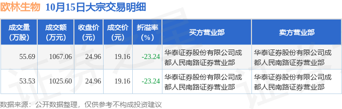 10月15日欧林生物现2笔折价23.24%的大宗交易 合计成交2092.66万元
