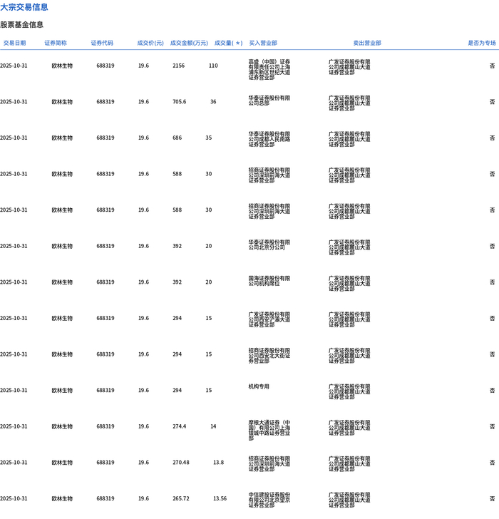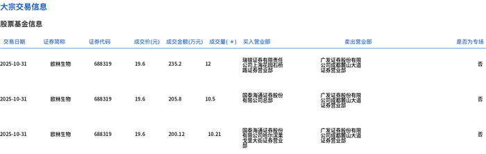 10月31日,欧林生物大宗交易成交400.07万股,成交额7841.32万元,占当日总成交额的21.81%,成交价19.6元,较市场收盘价25.09元折价21.88%。