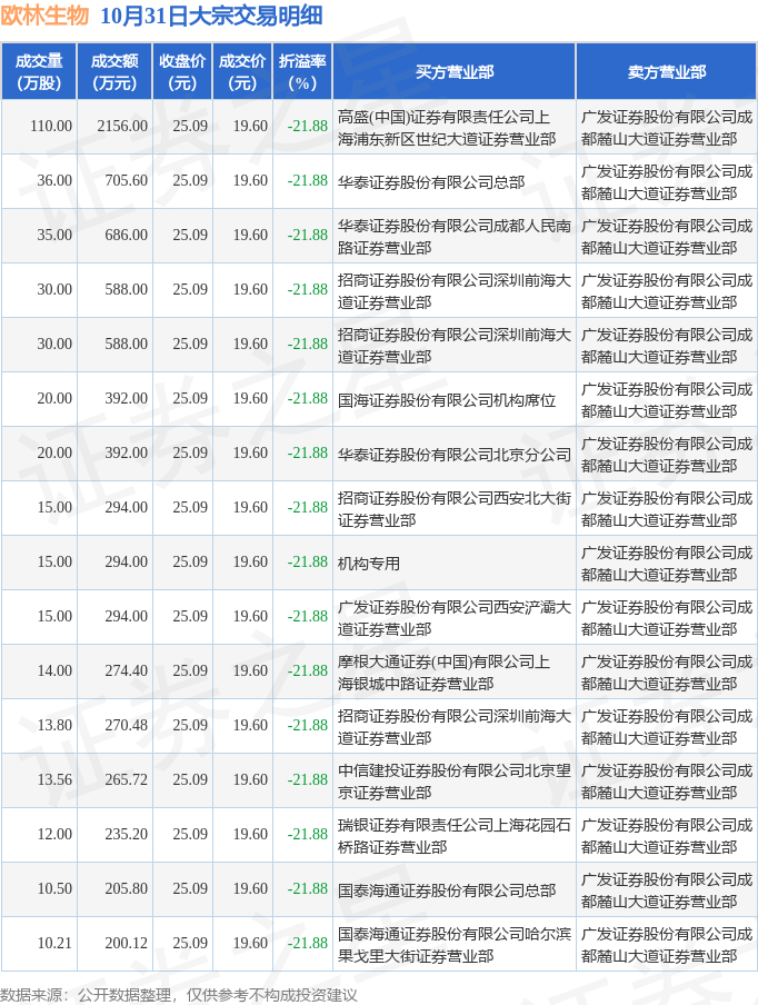 10月31日欧林生物现16笔折价21.88%的大宗交易 合计成交7841.32万元