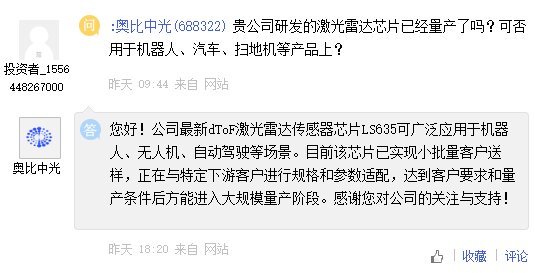 中国财富通11月12日 - 奥比中光(688322)在互动平台上表示,公司最新dToF激光雷达传感器芯片LS635可广泛应用于机器人、无人机、自动驾驶等场景。目前该芯片已实现小批量客户送样,正在与特定下游客户进行规格和参数适配,达到客户要求和量产条件后方能进入大规模量产阶段。