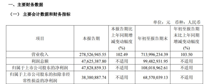 其中,第三季度单季营收2.79亿元,同比增长102.49%,归母净利润4782.89万元,环比第二季度增长33.32%,连续三个季度业绩攀升,创历史新高。