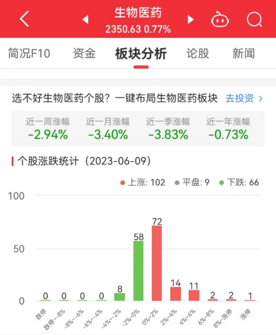 中国经济网北京6月9日讯今日,生物医药板块整体涨幅0.77%,其中102只股票上涨,9只股票平盘,66只股票下跌。