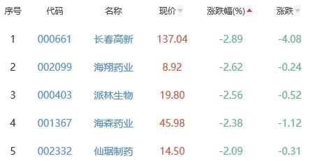 长春高新、海翔药业、派林生物、海森药业、仙琚制药位列涨幅榜后五位,涨幅分别为-2.89%、-2.62%、-2.56%、-2.38%、-2.09%。