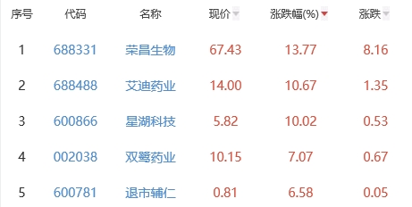 其中,荣昌生物、艾迪药业、星湖科技、双鹭药业、退市辅仁位列板块涨幅前五位,涨幅分别为13.77%、10.67%、10.02%、7.07%、6.58%。