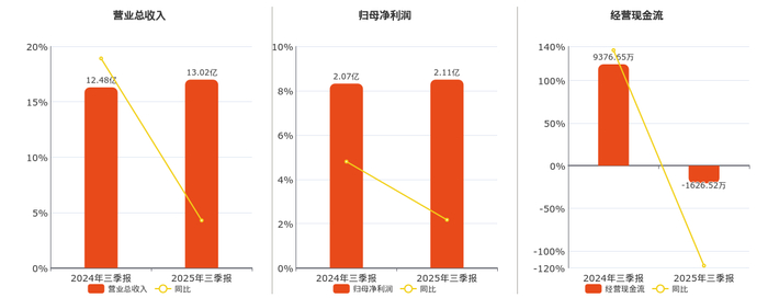 公司营业总收入为13.02亿元。归母净利润为2.11亿元。经营活动现金净流入为-1626.52万元,较去年同报告期经营活动现金净流入减少1.10亿元,同比较去年同期下降117.35%。