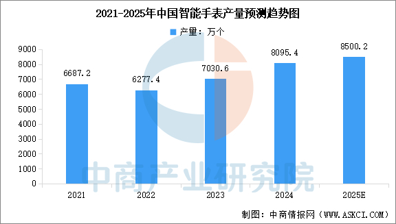 中商产业研究院发布的《2025-2030年中国智能手表分析及发展趋势研究预测报告》显示,2024年中国智能手表产量达到8095.4万个,2025年产量将达到8500万个,市场规模将达到413.8亿元。而2025年全球智能手表出货量预计将超过1.5亿个,市场规模为400-500亿美元。