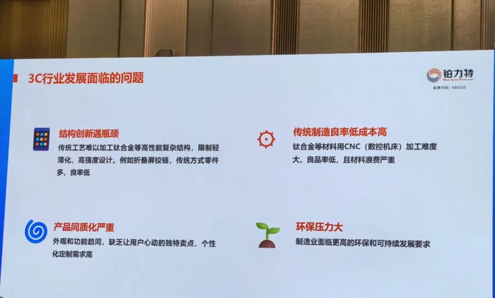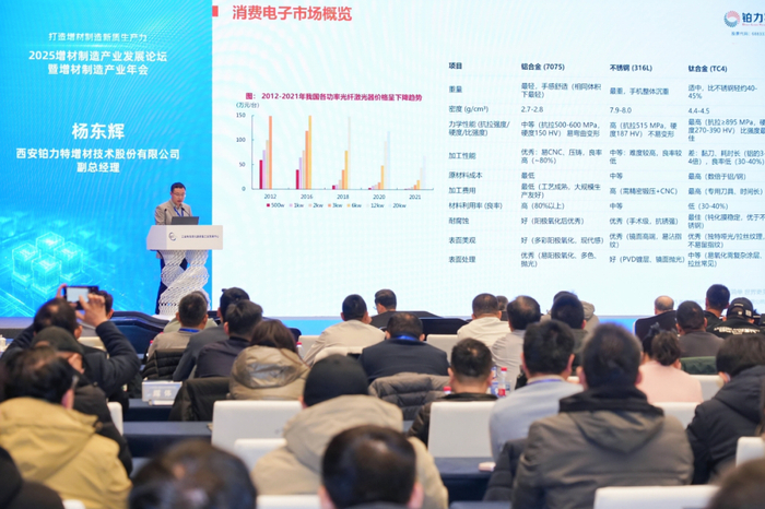 在2025年12月于雄安举办的增材制造产业年会上,铂力特副总经理杨东辉介绍了该公司在消费电子领域的应用和解决方案。铂力特作为全球行业内首家将3D打印技术批量、规模化应用于电子3C行业的企业,对应用市场及技术应用有怎样的理解呢?