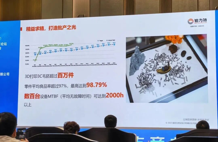 此外,面向批量生产,铂力特优化了设备的稳定运行。数百台设备的平均无故障时间达到了2000小时以上。目前其打印的3C毛坯零件超百万件,良品率超97%,最高达到98.79%。