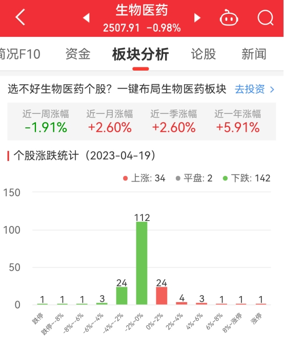 中国经济网北京4月19日讯今日,生物医药板块整体跌幅0.98%,其中34只股票上涨,2只股票平盘,142只股票下跌。