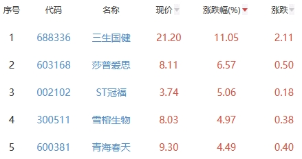 其中,三生国健、莎普爱思、ST冠福、雪榕生物、青海春天位列板块涨幅前五位,涨幅分别为11.05%、6.57%、5.06%、4.97%、4.49%。