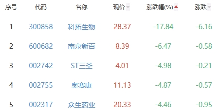 科拓生物、南京新百、ST三圣、奥赛康、众生药业位列涨幅榜后五位,涨幅分别为-17.84%、-6.47%、-4.98%、-4.87%、-4.46%。