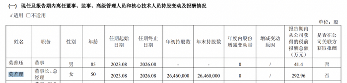 2024年,莫若理、莫善珏薪酬分别为292.96万元、41.4万元。