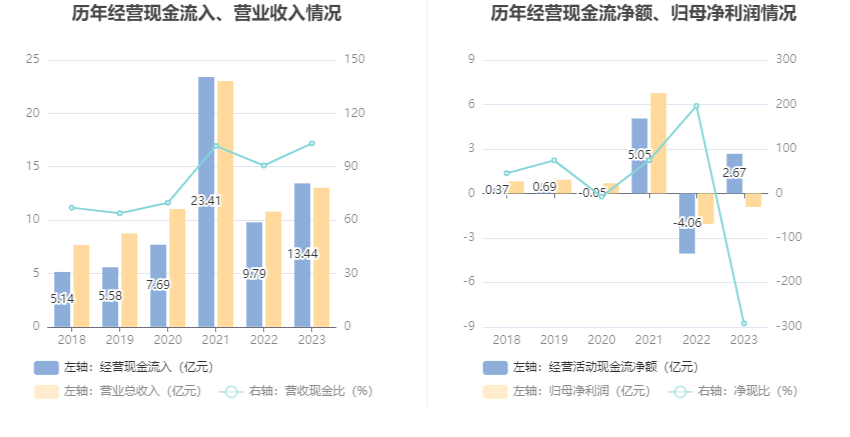 2023年,公司营业收入现金比为103.11%,净现比为-292.45%。
