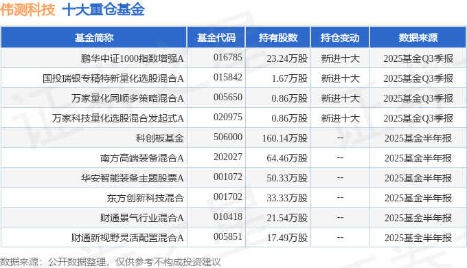 持有伟测科技最多的基金为鹏华中证1000指数增强A,目前规模为10.95亿元,最新净值1.5539(10月27日),较上一交易日上涨0.94%,近一年上涨53.04%。该基金现任基金经理为苏俊杰 时赟超。