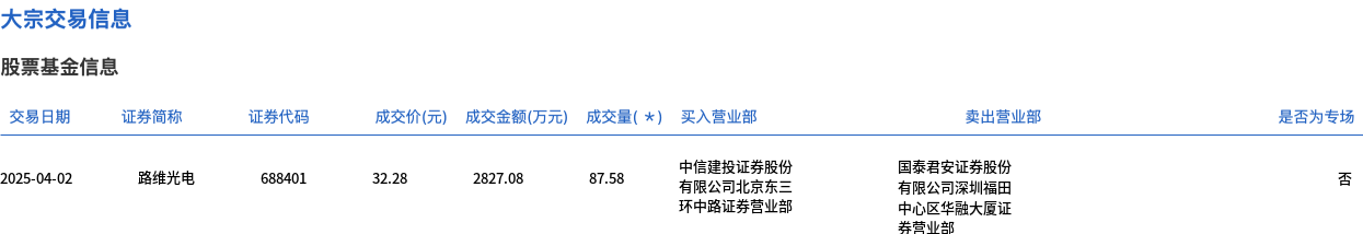 大宗交易成交87.58万股,成交额2827.08万元,占当日总成交额的8.29%,成交价32.28元,较市场收盘价35.09元折价8.01%。