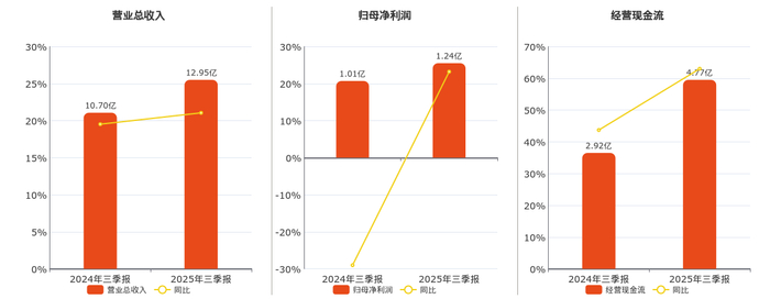 公司营业总收入为12.95亿元。归母净利润为1.24亿元。经营活动现金净流入为4.77亿元。
