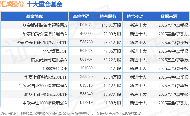 重仓汇成股份的前十大公募基金请见下表: