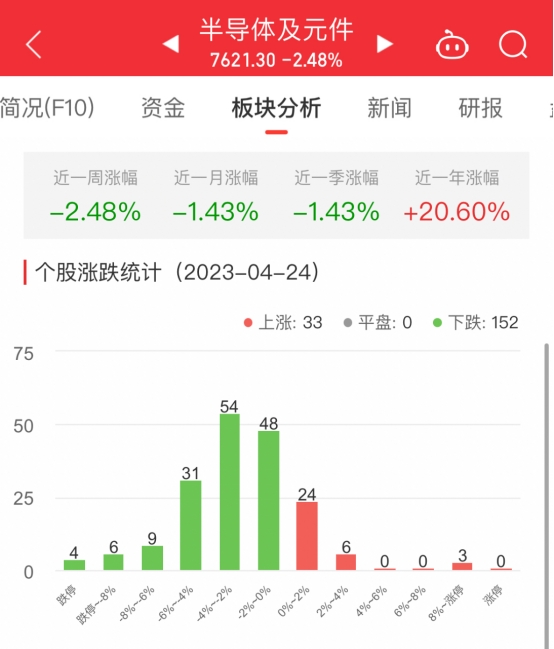 中国经济网北京4月24日讯今日,半导体及元件板块整体涨幅-2.48%,其中33只股票上涨,152只股票下跌。
