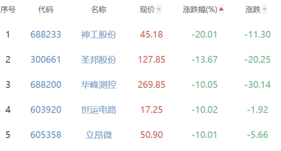 神工股份、圣邦股份、华峰测控、世运电路、立昂微位列涨幅榜后五位,涨幅分别为-20.01%、-13.67%、-10.05%、-10.02%、-10.01%。