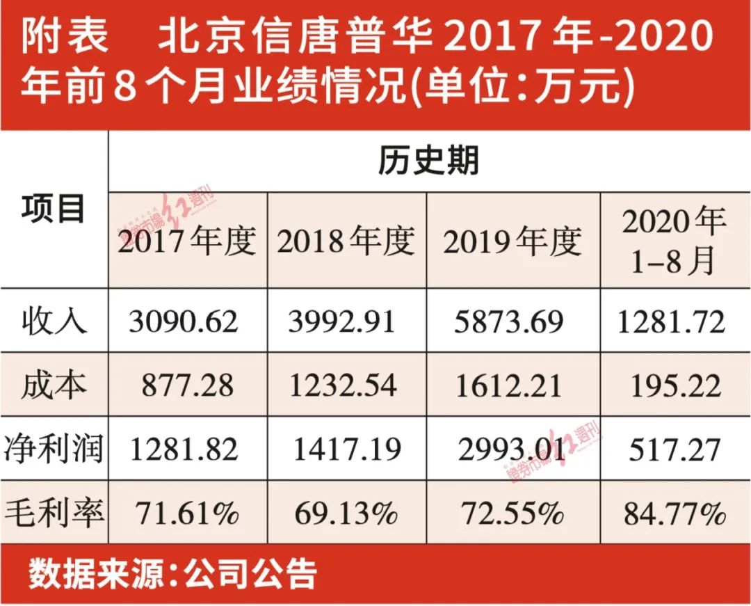 在慧辰股份2020年10月21日《关于收购北京信唐普华科技有限公司22%股权的补充公告》中,2017年、2018年及2019年信唐普华分别实现收入3090.62万元、3992.91万元和5873.69万元,收入增长率为29.19%和47.10%;实现净利润1281.82万元、1417.19万元和2993.01万元,净利润增长率为10.56%和111.19%(见附表)。