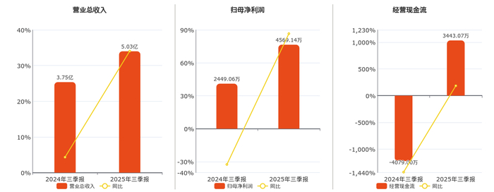 公司营业总收入为5.03亿元,在已披露的同业公司中排名第73。归母净利润为4569.14万元。经营活动现金净流入为3443.07万元,在已披露的同业公司中排名第56。
