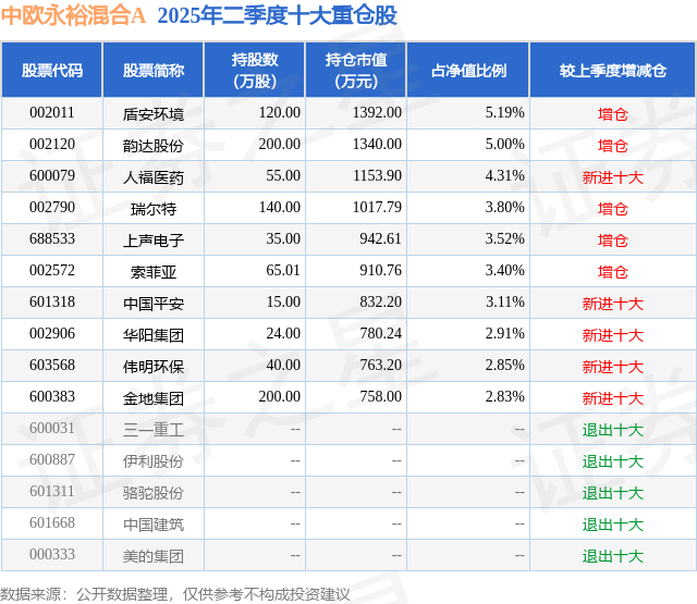 根据2025基金半年报公募基金重仓股数据,重仓该股的公募基金共3家,其中持有数量最多的公募基金为中欧基金的中欧永裕混合A。中欧永裕混合A目前规模为2.51亿元,最新净值1.3347(8月29日),较上一交易日下跌0.39%,近一年上涨37.68%。该公募基金现任基金经理为沈悦。沈悦在任的基金产品包括:中欧潜力价值灵活配置混合A,管理时间为2020年5月12日至今,期间收益率为71.31%;中欧成长优选混合A,管理时间为2020年5月12日至今,期间收益率为114.52%;中欧恒利三年定期开放混合,管理时间为2020年7月31日至今,期间收益率为50.14%;