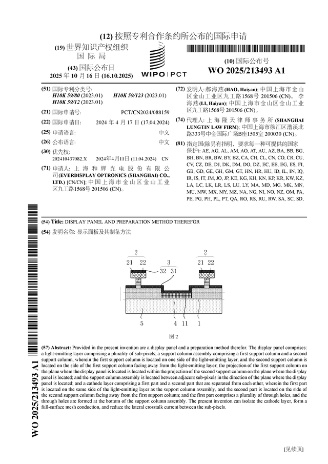 和辉光电公布国际专利申请:“显示面板及其制备方法”