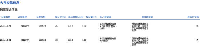 10月31日,和辉光电大宗交易成交1000万股,成交额2700万元,占当日总成交额的11.48%,成交价2.7元,较市场收盘价2.72元折价0.74%。