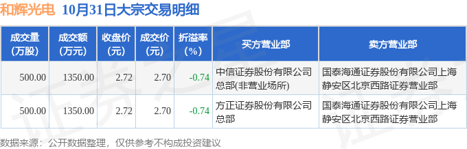 证券之星消息,10月31日和辉光电发生大宗交易,交易数据如下: