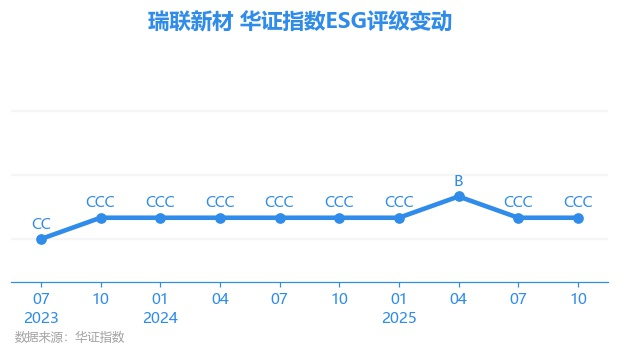 日前,华证指数公布了新一期(2025年10月31日)的ESG评级结果,瑞联新材(688550.SH)获得CCC评级(华证指数评级为C起至AAA九档,C为最低档,AAA为其最高一级评级/AA为其第二档),上一期(2025年7月31日)ESG评级为CCC。本期ESG评级在494家化学制品行业A股上市公司中排名第399(上一期排名第381)。
