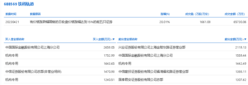 4月21日,铁科轨道今日涨停,龙虎榜数据显示,上榜营业部席位全天成交1.66亿元,占当日总成交金额比例为25.23%。其中,买入金额为8767.18万元,卖出金额为7816.79万元,合计净买入950.39万元。