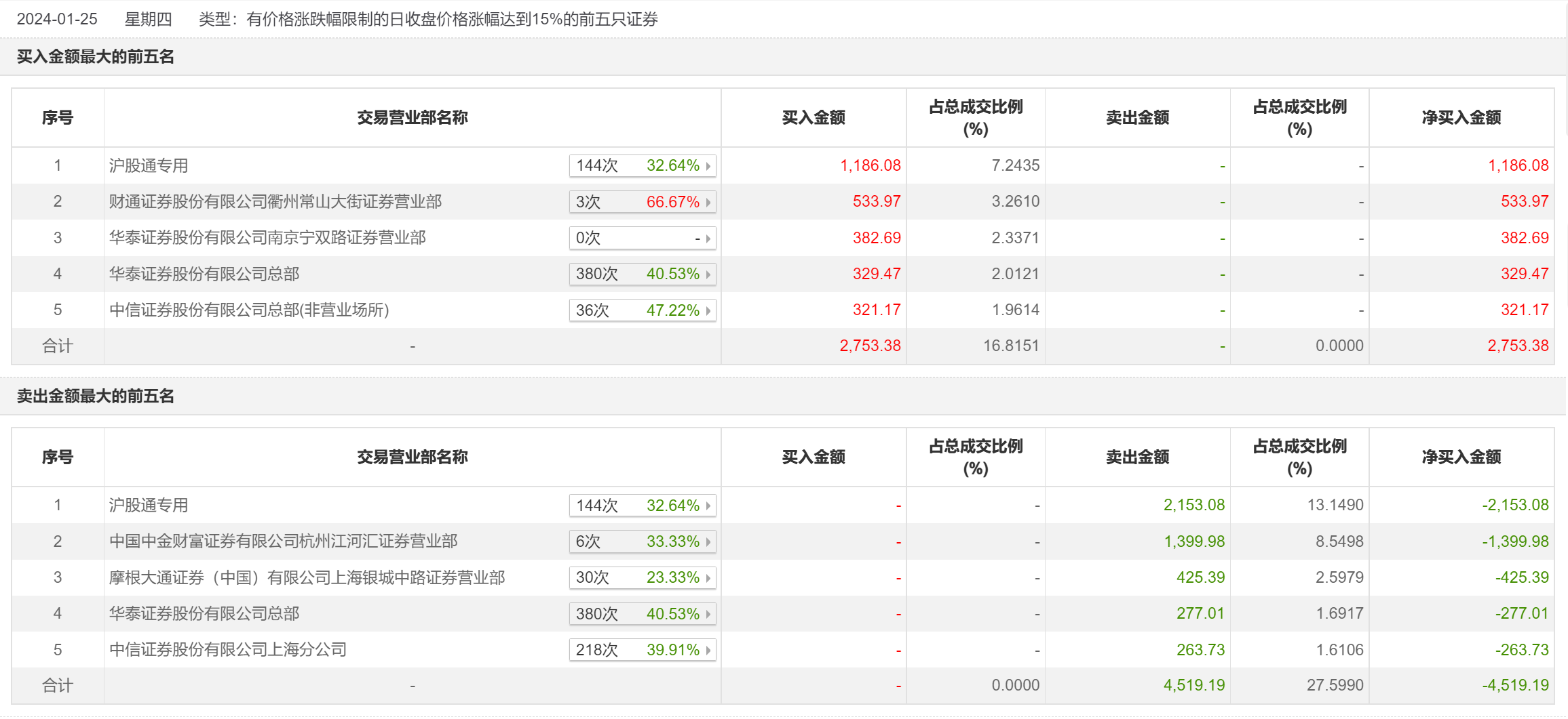 1月25日,铁科轨道今日涨18.73%,全天换手率达4.6%,振幅达21.63%。龙虎榜数据显示,营业部席位合计净卖出1765.8万元。其中,沪股通专用、财通证券衢州常山大街证券营业部分别买入1186.08万元、533.97万元;沪股通专用、中国中金财富证券有限公司杭州江河汇证券营业部分别卖出2153.08万元、1399.98万元。