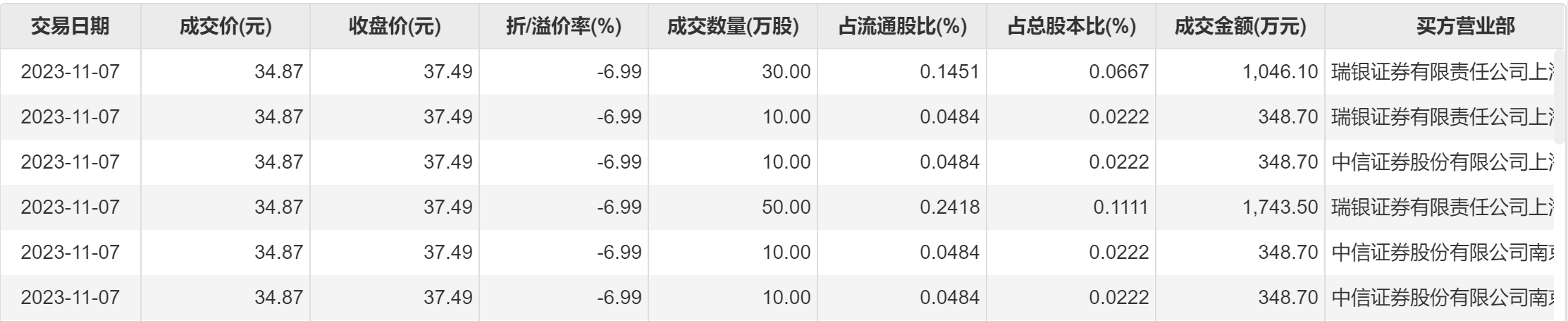 今日大宗交易成交120万股,成交额4184.4万元,占当日总成交额的12.69%,成交价34.87元,较市场收盘价折价6.99%。