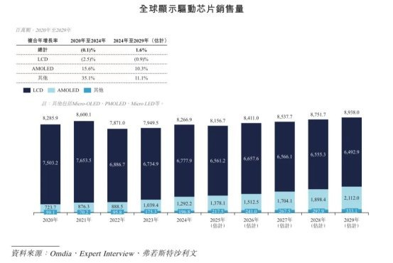 业绩增长背后,持续的研发投入成为关键支撑。今年前三季度新相微研发投入达 5240 万元,同比增长 23.83%,研发投入占营收比例为12.01%。这一投入强度与行业转型节奏高度契合,2024年LCD显示驱动芯片仍为全球市场主导类型,销量为约67.779亿颗,占显示驱动芯片总销量的82.0%。随着AMOLED在下游应用的渗透率逐渐提升,预计AMOLED显示驱动芯片将成为未来几年的主要增长驱动因素,其全球市场份额预测将从2024年的15.6%扩大至2029年的23.6%。新相微在 AMOLED、MicroLED 等高端芯片领域的技术积累,正逐步转化为市场竞争力。