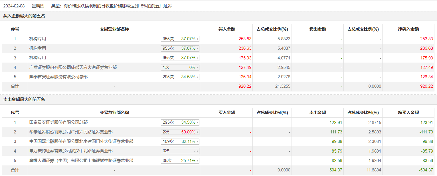 康众医疗2月8日涨停,全天换手率达4.48%,振幅达22.33%。龙虎榜数据显示,营业部席位合计净买入415.85万元。其中,机构合计净买入666.39万元。此外,广发证券成都天府大道证券营业部、国泰君安证券总部分别买入127.49万元、126.34万元;国泰君安证券总部、华泰证券广州兴民路证券营业部分别卖出123.91万元、111.73万元。