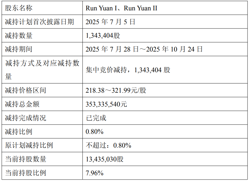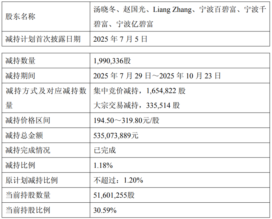 公司近日收到上述股东分别出具的关于股份减持结果的告知函,截至2025年10月27日, Liang Zhang、赵国光、汤晓冬和一致行动人宁波百碧富、宁波千碧富、宁波亿碧富通过集中竞价交易和大宗交易方式累计减持了公司股份1,990,336股,占公司当前总股本的1.18%;Run Yuan I、Run Yuan II通过集中竞价交易方式累计减持了公司股份1,343,404 股,占公司当前总股本的0.80%。本次减持已按计划实施完毕。