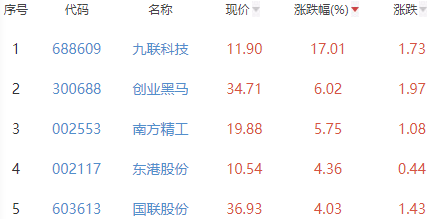 其中,九联科技、创业黑马、南方精工、东港股份和国联股份位列板块涨幅前五位,涨幅分别为17.01%、6.02%、5.75%、4.36%和4.03%。