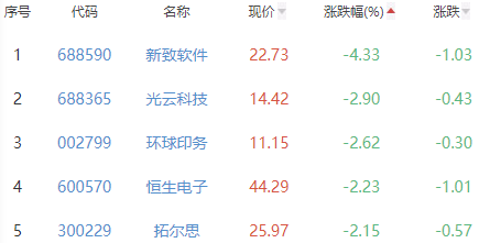 新致软件、光云科技、环球印务、恒生电子和拓尔思位列涨幅榜后五位,涨幅分别为-4.33%、-2.90%、-2.62%、-2.23%和-2.15%。