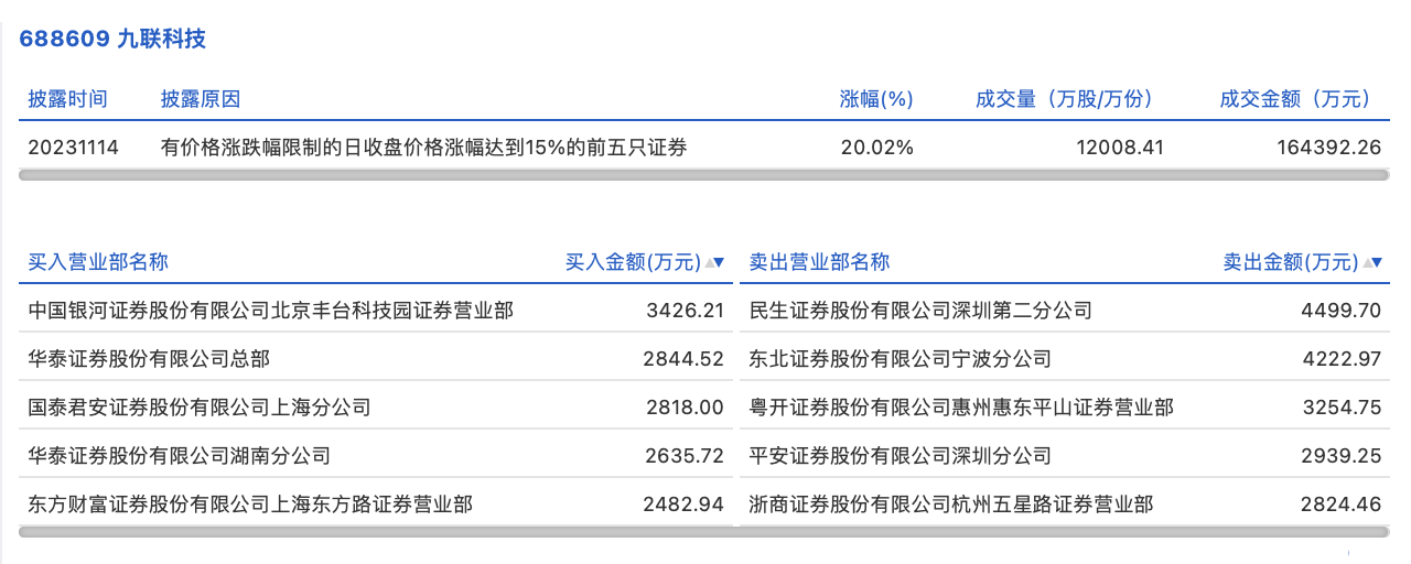 11月14日,九联科技今日涨停,全天换手率达36.52%,振幅达10.9%。龙虎榜数据显示,营业部席位合计净卖出3533.74万元。其中,中国银河证券北京丰台科技园证券营业部、华泰证券总部分别买入3426.21万元、2844.52万元;民生证券深圳第二分公司、东北证券宁波分公司分别卖出4499.70万元、4222.97万元。